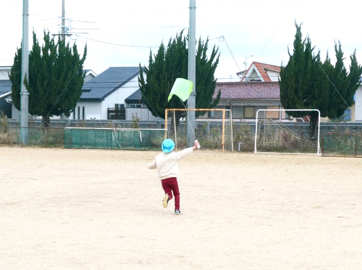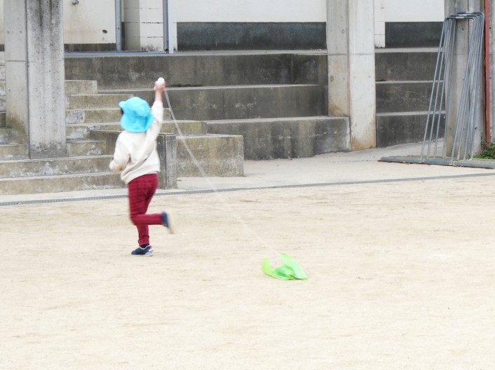 走り、止まり、風と仲良くなりながら手や指の感覚を生かし、全身で凧あげの「コツ」を得ていきました。