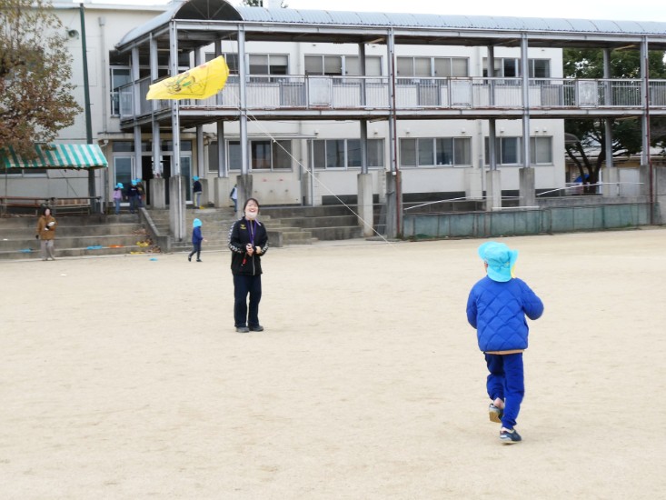 1月14日(水)午前、隣接する附属幼稚園の子どもたちが本校グラウンドで凧あげを楽しみました。