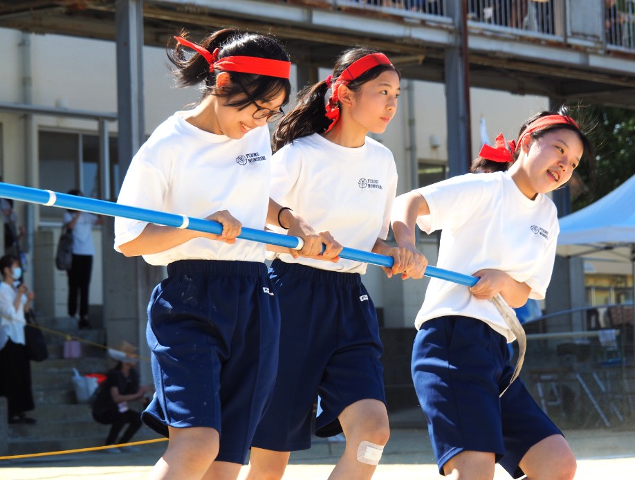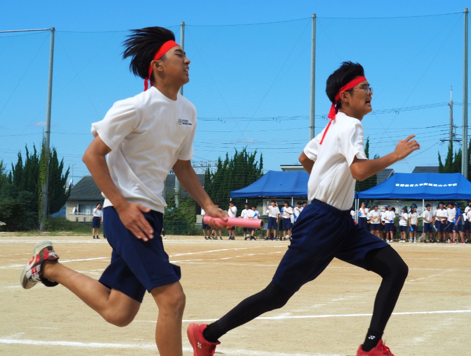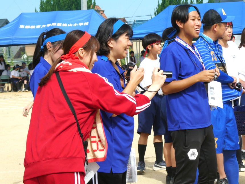 1年生から3年生まで赤組と青組に分かれ、3年生が1、2年生をリードし、学年を超えて協力して取り組み、思い切り楽しみました。また、教職員もこの日のために「附属桃山中体育大会ポロシャツ」を作り、ポロシャツだけでなく、赤組の教員は赤で、青組の教員は青で服装をコーディネートし、教職員も気合十分でした。