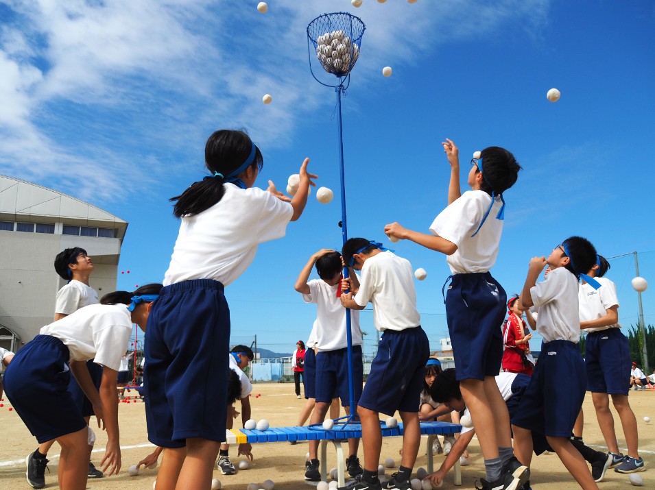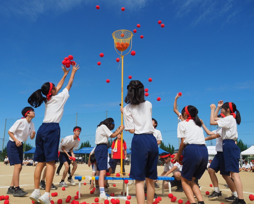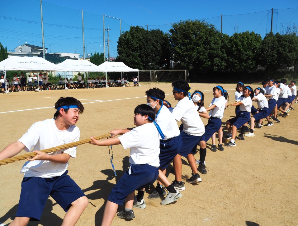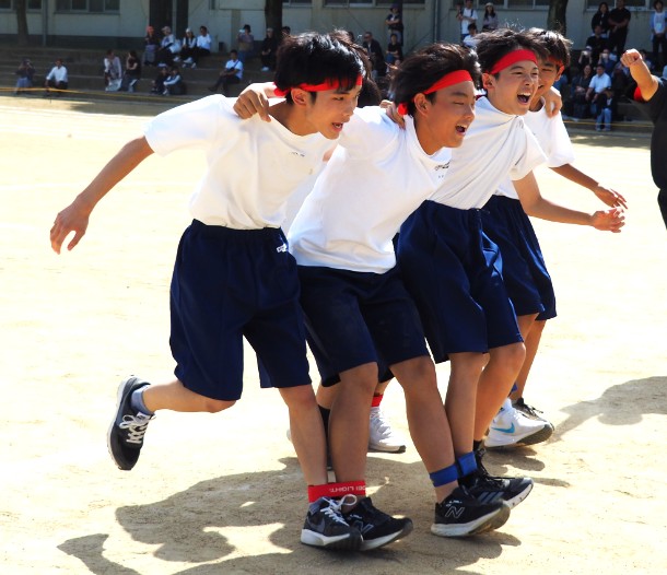 団体種目の台風の目や3人4脚、綱引き、玉入れでは、異学年の仲間とチームを組み、競い合いました。この体育大会の取り組みを通して仲良くなった仲間と肩を組んで喜び合う姿。体育大会ならではの光景でした。