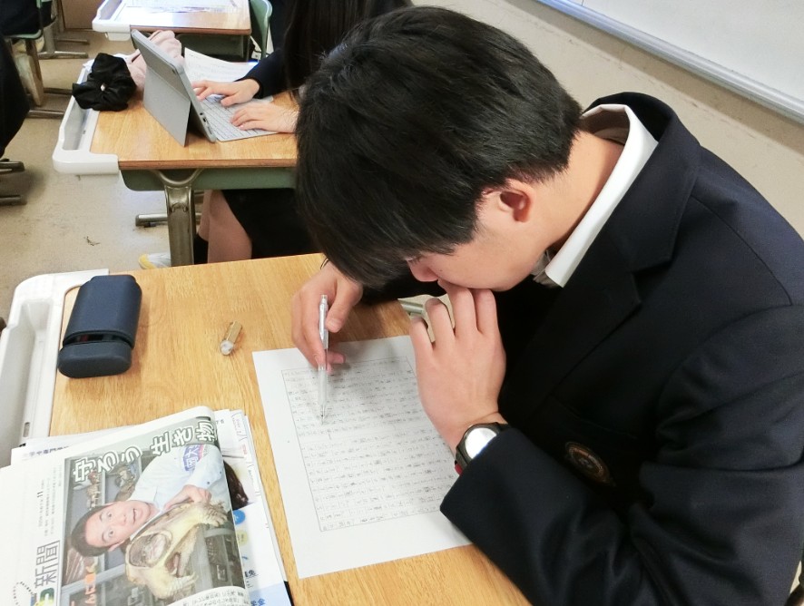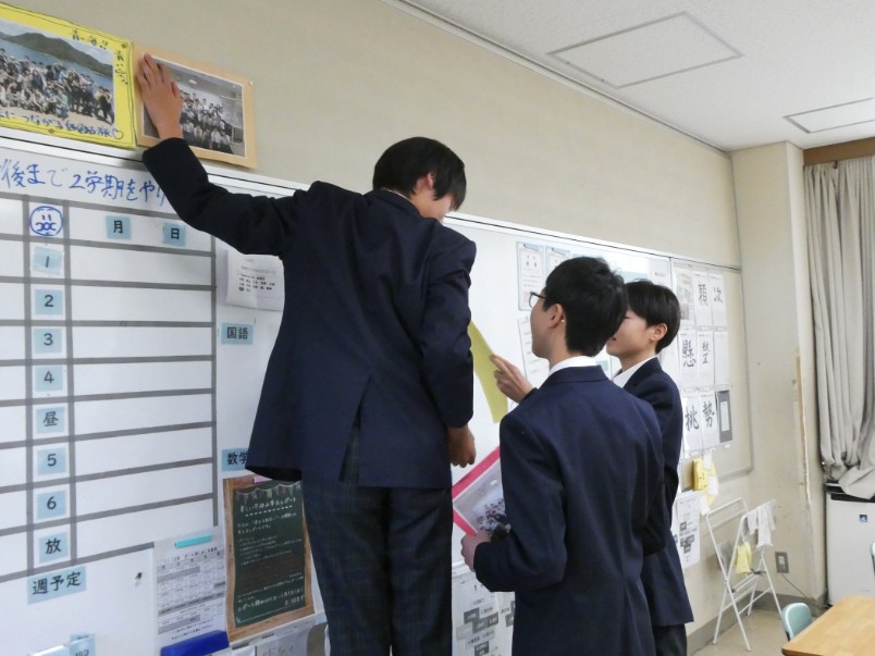 生徒会本部からの連絡では、「得意を生かすプロジェクト」が始動しました。「得意を生かすプロジェクト」とは、生徒一人一人の「得意なこと」を学校行事に生かす活動で、仲間の特技を認め合い、仲間の輪を広げることをねらいとしています。例えば、本校の入試やオープンスクールで、書道や絵が得意な生徒が来校者に向けてメッセーボードを作成したりします。まずは、17日(土)に行われる入試で、受検生に向けて掲示するメッセージボードに取り組むそうです。