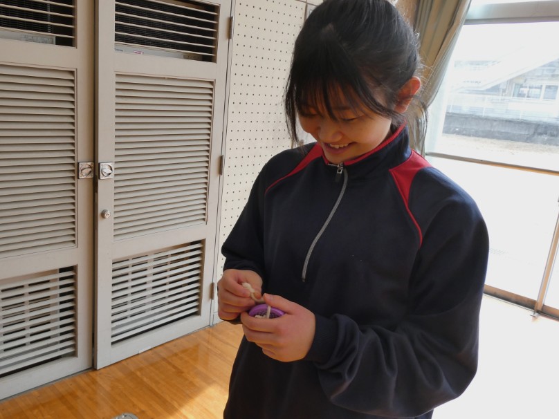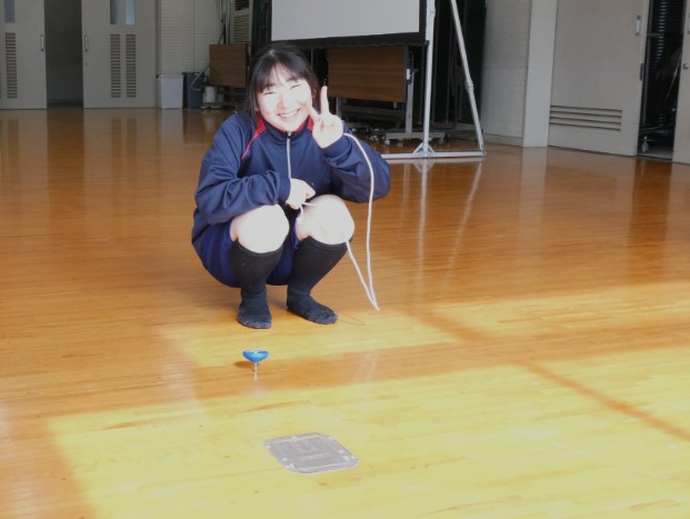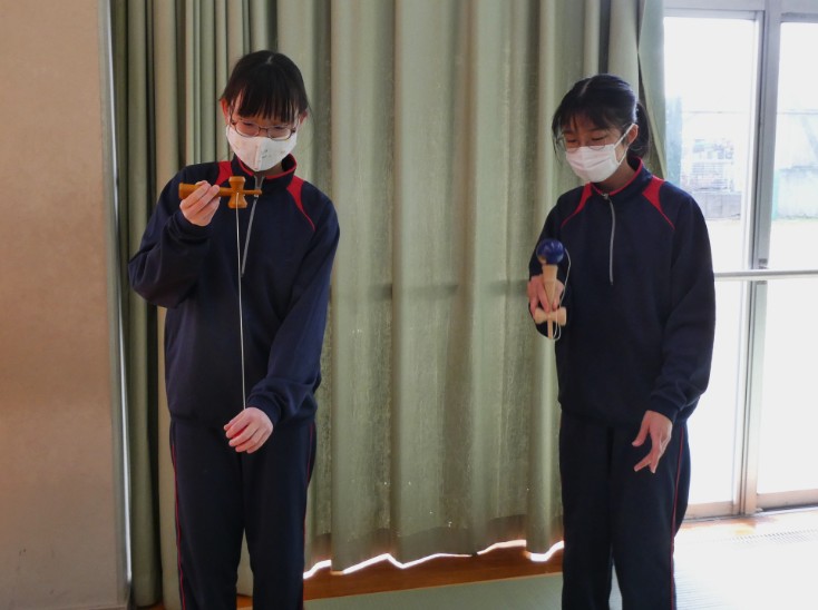 生徒たちは、こま回しやけん玉などに挑戦しました。